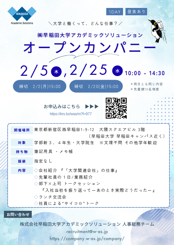 株式会社早稲田大学アカデミックソリューションでは、この度「大学と働くって、どんな仕事?」をテーマにしたオープンカンパニーを開催いたします